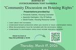 District 2 - Community Discussion on Housing Rights 19 Mar 2026 A community discussion on housing rights hosted by Councilmember Tony Barrera with presentations from ECHO Housing and the Housing Resource Center. The discussion will cover rent increases, tenant protections, termination notices, relocation benefits, and more. Cesar Chavez Library, 615 Williams Road, 93905 Tagged as: , Community Event